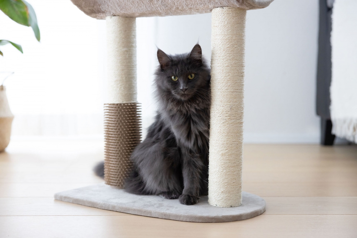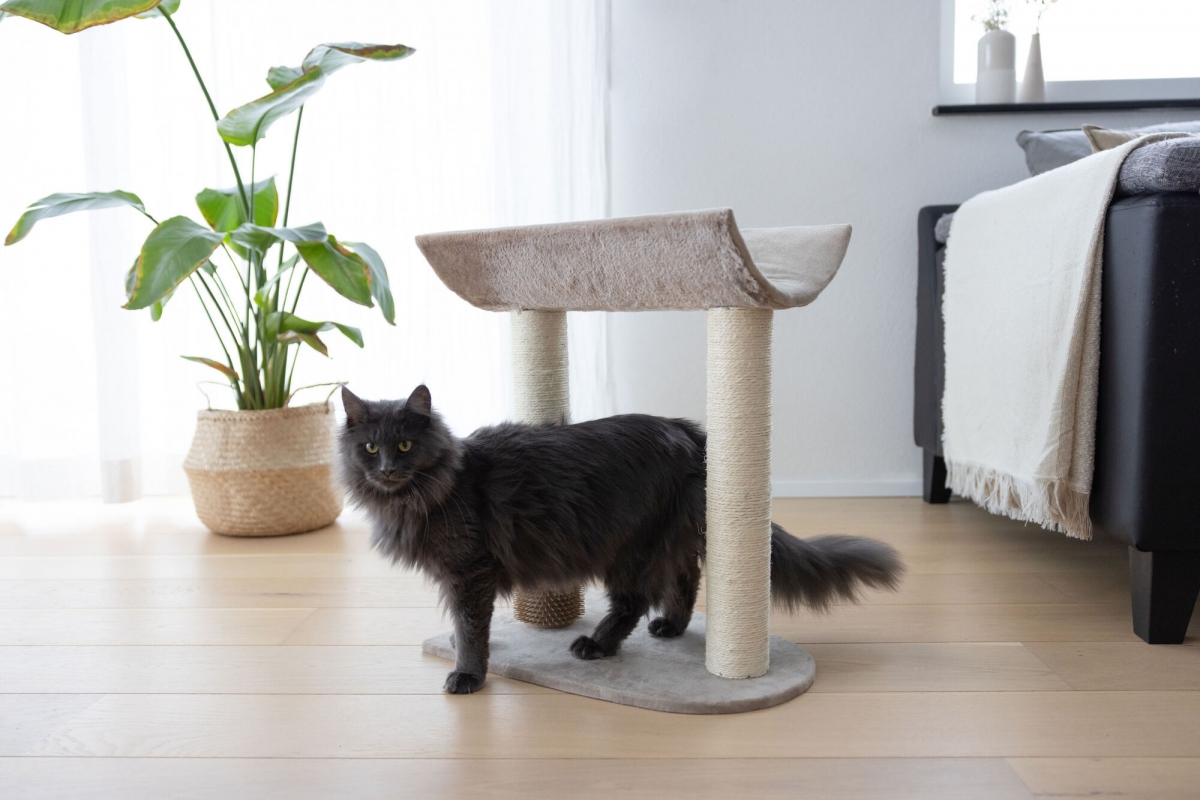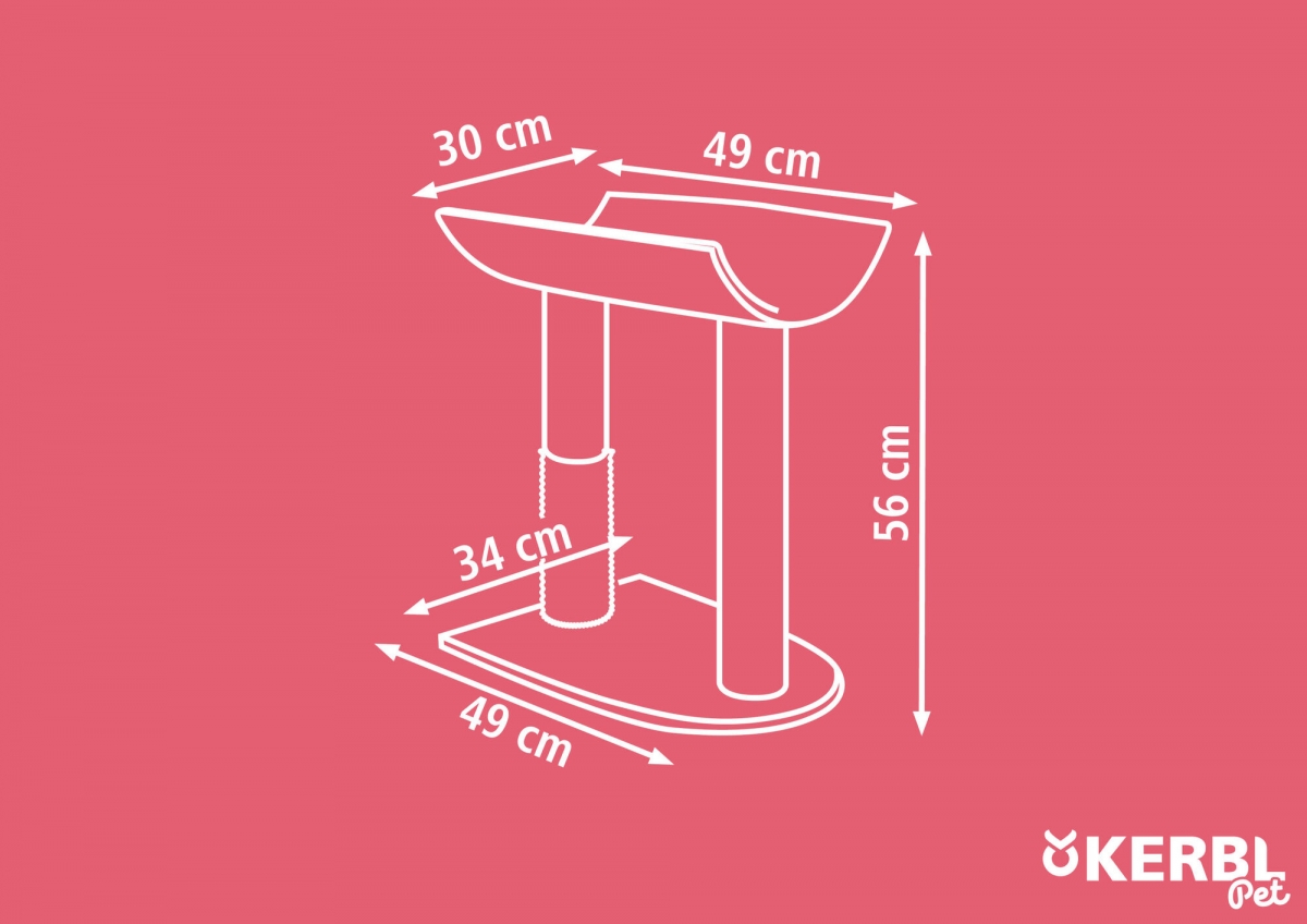 Arbre à chat Ambiance taupe, 49x35x56 cm - Couchage rembourrée : 49 x 30 cm|Base : 49 x 34 cm|picots de massage en caoutchouc sur le poteau|Sisal : ø 3,8 mm collé sur les troncs|Housse : peluche à poils courts, 100 % polyester