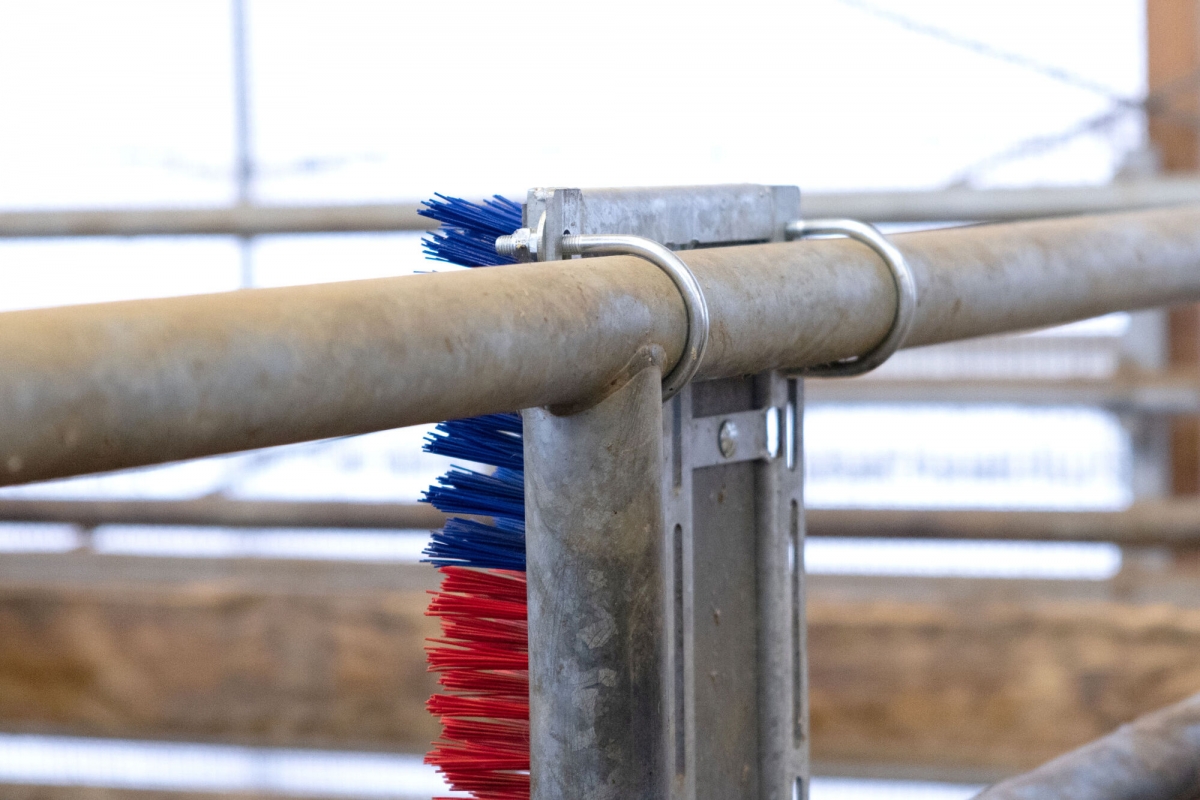 Brosse Bully, 90x30 cm, rouge et bleu - permet à l’animal de se gratter la tête et les flancs|construction très robuste en acier galvanisée à chaud et conçue pour l’engraissement des taureaux|montage flexible aux box ou murs|montage réglable en hauteur et flexible grâce aux trous ovales intégrés|poils résistants de qualité élevée|barres de brosse interchangeables|dos de brosse en matière 100 % recyclée|convient à l’initiative pour le bien-être animal dans l’engraissement des bovins