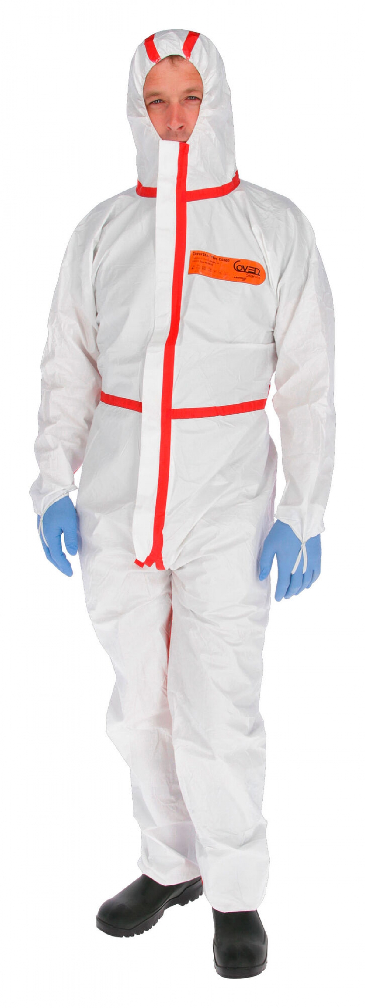 Combinaison phytosanitaire Typ 4, blanc/rouge, taille L - combinaison de protection contre les éclaboussures de produits chimiques, cat. III, type 4B, 5B et 6B, convient à l’emploi de produits phytosanitaires|Prévention des infections dues au sang et aux virus|blanche avec fermeture à glissière à rabat autoadhésif rouge|tissu non tissé à l'intérieur offrant un confort de port agréable, et polyéthylène résistant aux éclaboussures à l'extérieur|respirant, tout en étant imperméable|capuche en 3 pièces|Boucle de fixation pour éviter que les manches ne glissent vers le haut|ajustement parfait grâce à des élastiques au niveau des bras, des jambes et de la taille|conformité EN 13034:2005+A1:2009, EN ISO 13982-1:2004+A1:2010, EN 14605:2005+A1:2009, EN 1073-2:2002, EN 1149-5:2008, EN 14126:2003+AC:2004, EN 369, ISO 14644 classes ISO-7, ISO-8, ISO-9|Utilisations : Manipulation de produits chimiques agricoles, lutte contre les maladies, lutte antiparasitaire, industrie alimentaire, élimination des sites contaminés, élimination de l'amiante, applications en salle blanche, etc.