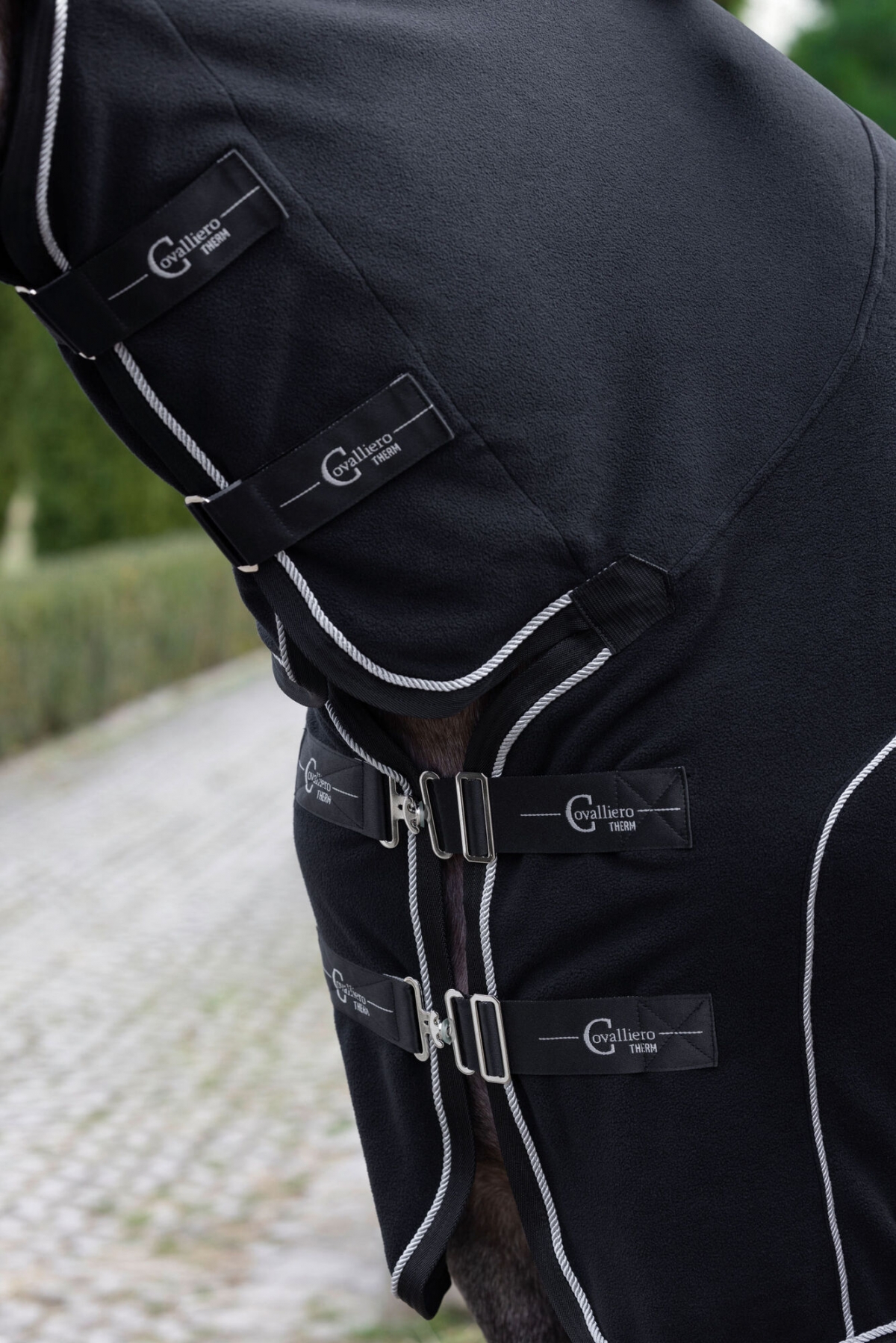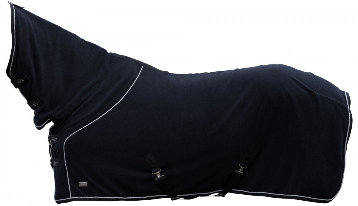 Couv. polaire Cova-Tex, noire avec high neck, 155 cm - le matériau CovallieroTherm innovant avec des particules de céramique intégrées peut augmenter le bien-être du cheval|couverture en polaire haute avec high neck|propriétés respirantes et séchage rapide|double bouclage de poitrail avec des boucles à ardillon|avec croupière|sangles croisées réglables