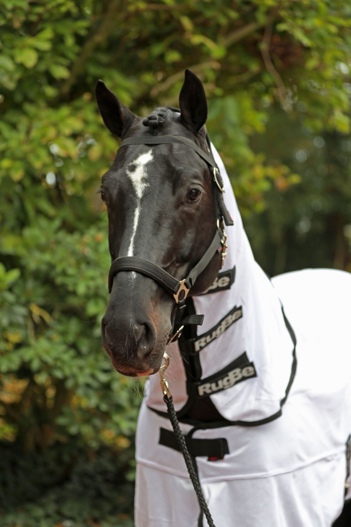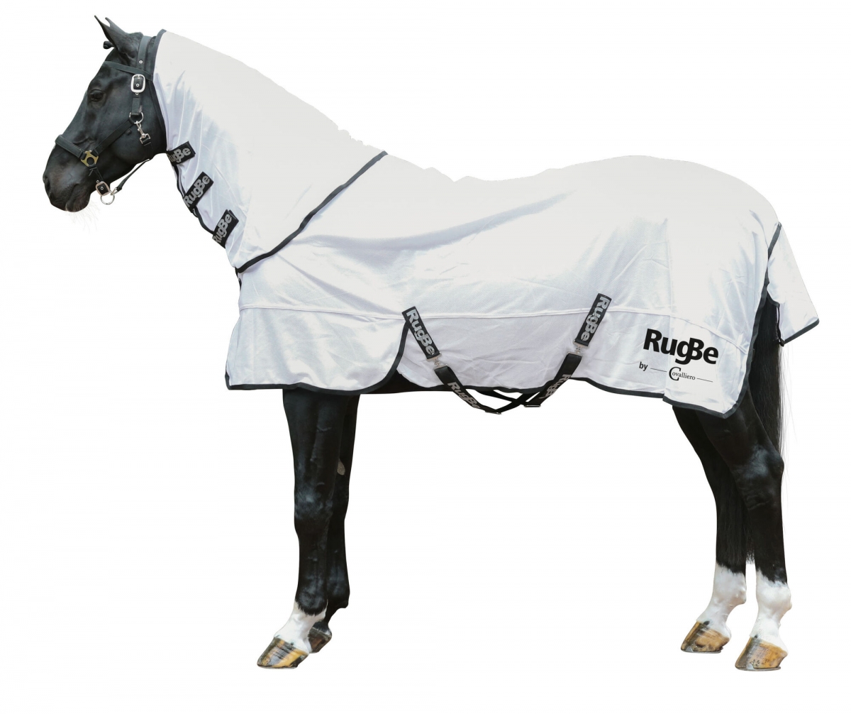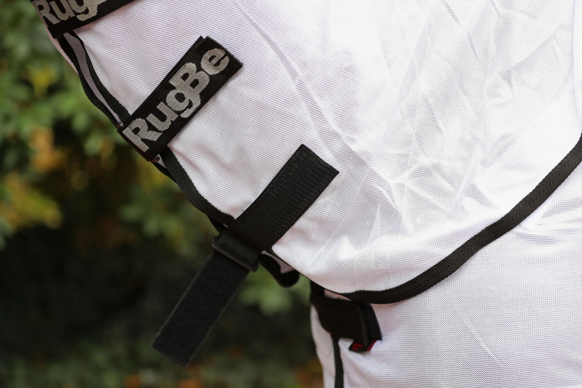 Couverture RugBe SuperFly blanche, 115 cm - couverture légère et résistante particulièrement agréable pour le pré et le paddock|la matière brillante et respirante, ainsi que la couleur claire protègent contre les surchauffes|polyester souple à mailles serrées offrant une protection optimale contre les mouches et les insectes agressifs|courroies de cuisse amovibles et élastiques pour empêcher la couverture de glisser|high neck amovible à fixer avec des fermetures scratch|rabat de queue large|avec fermetures scratch au niveau du cou et du poitrail|Doublure au poitrail|Résiste aux UV