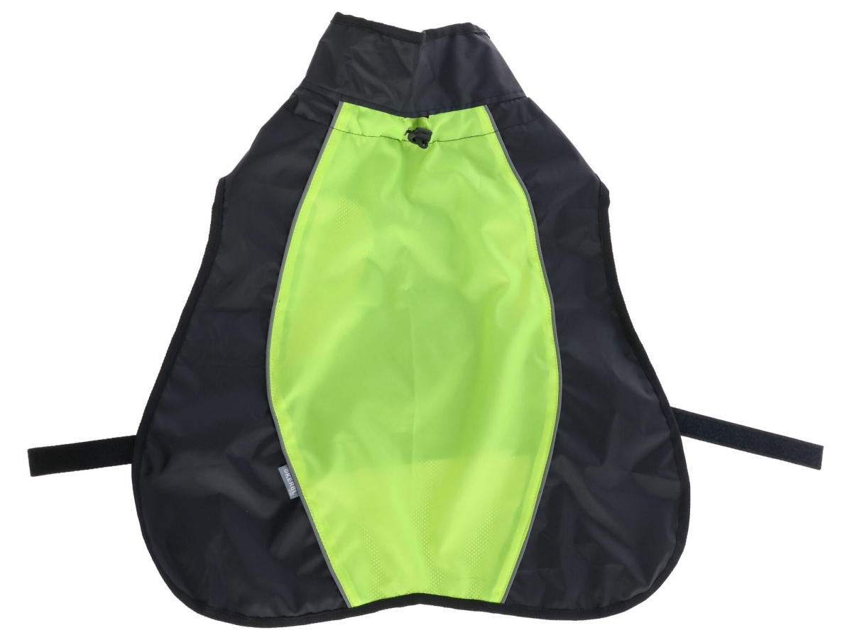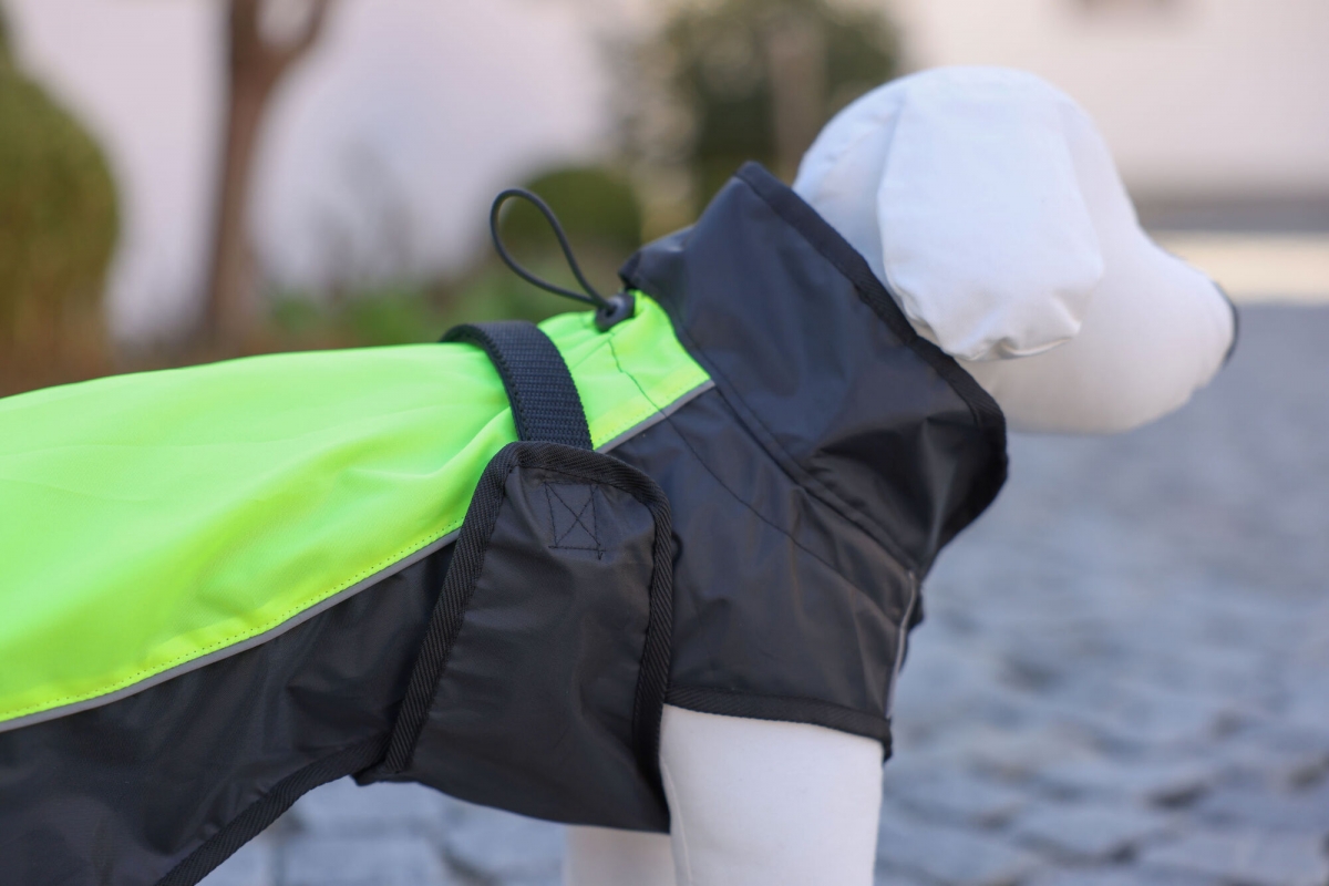 Manteau pour chien Malmö 45cm - manteau pour chien respirant et de protection contre le vent et la pluie|haute visibilité grâce aux bandes réfléchissantes et à la grande surface dorsale jaune fluo|imperméable et coupe-vent|avec cordon de réglage au niveau du cou pour une fixation optimale du col montant|sangle ventrale à réglage individuel au moyen de crochets et boucles|avec fente pour la laisse|intérieur en maille respirante et douce|sangles en caoutchouc pour les pattes arrières