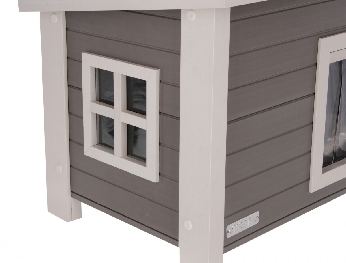 Maison pour chat ECO Eli gris/blanc, 57X45X43cm - abri résistant aux intempéries et lieu de repli pour le jardin, le balcon ou la terrasse|fabriqué à partir d’un mélange innovant et durable de plastique et de bois|Porte basculante avec des lamelles qui protègent du vent et du froid|vitre latérale en plexiglas pour apporter suffisamment de clarté à l’intérieur|toit rabattable avec fixation et surfaces lisses pour faciliter le nettoyage|fabrication écologique, bien isolée, résistante aux UV et aux intempéries|montage simple grâce aux trous pré-percés et aux filetages La maison pour chats de plein air Eli permet aux chats d’extérieur de se protéger du vent et des intempéries, de se cacher ou tout simplement de se reposer. Le mélange de matériaux ECO promet une fabrication respectueuse de l’environnement et une durée de vie nettement plus longue que celle des maisons pour chats traditionnelles.