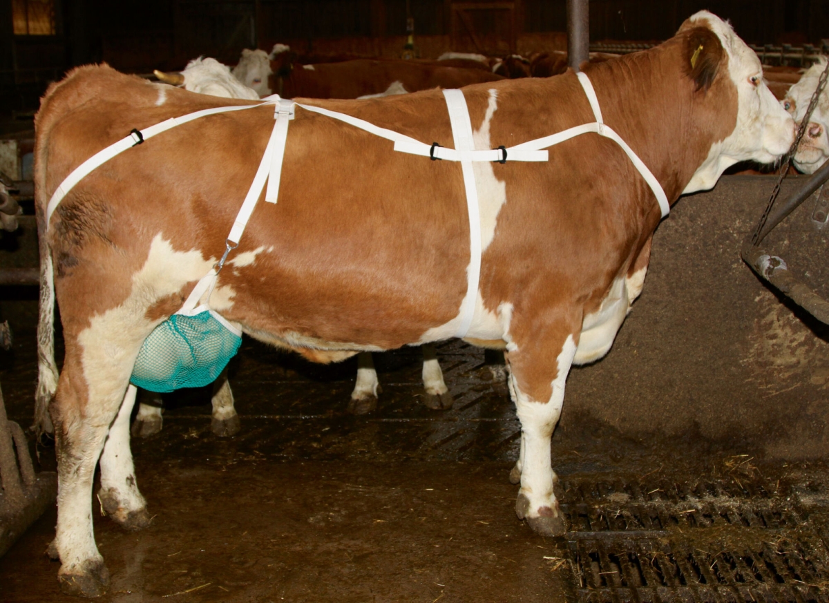 Filet de protection trayons avec sangles, Taille L - livraison avec une ceinture au niveau du poitrail et du cou permettant un ajustement parfait à la taille de la vache|cette protection des trayons évite les blessures pouvant se produire dans les étables trop étroites ou au pâturage|également idéal pour éviter les blessures dues aux coups de sabot