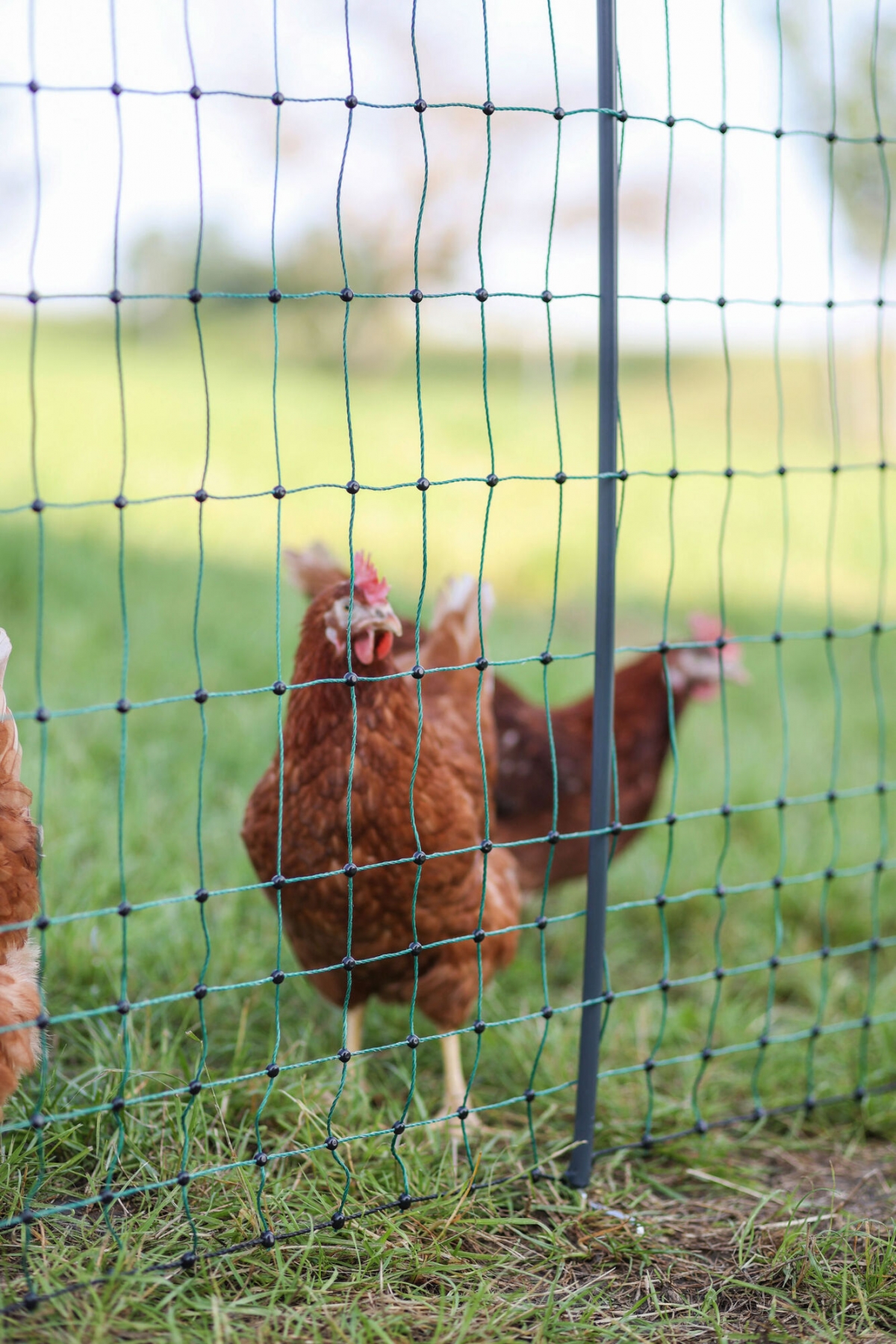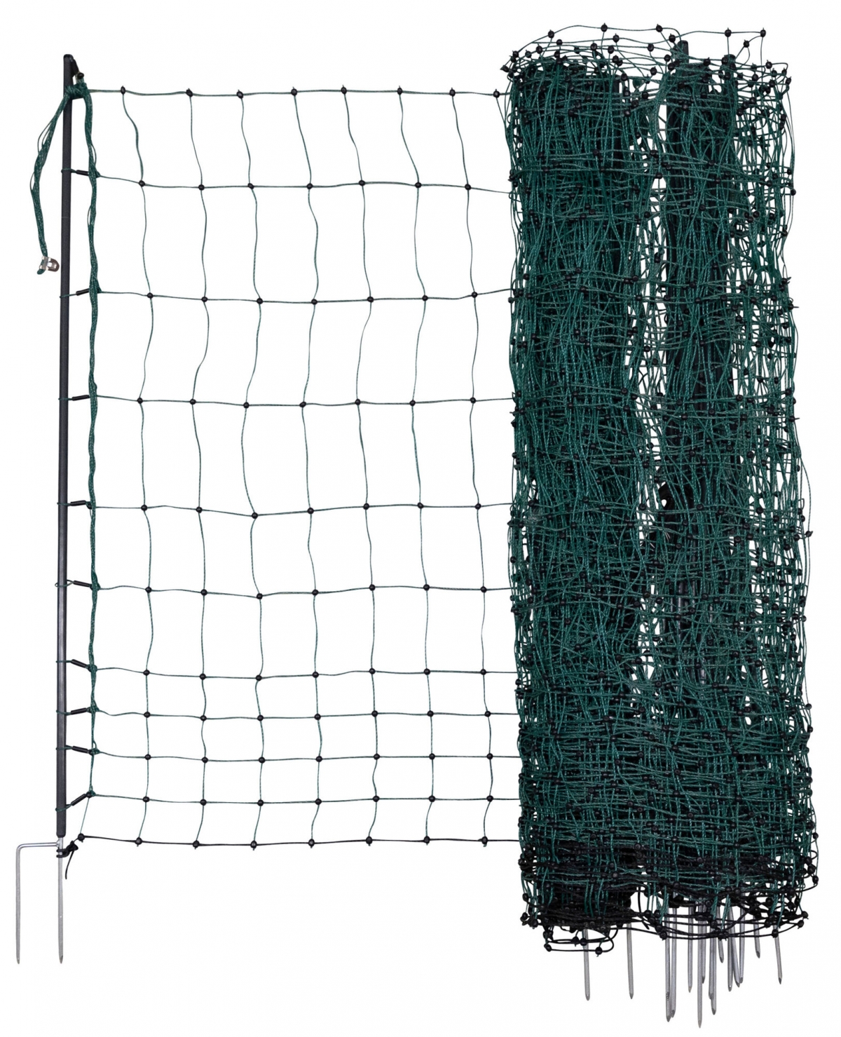 Filet vol. Premium, vert, 50 m 106 cm double pointe électrif. - piquets PREMIUM extrêmement robustes et stables avec pointe de piquet galvanisée|nœuds renforcés extrêmement résistants|maille très serrée dans la zone inférieure du filet|nos fils en plastique disposent d’une garantie de stabilité aux UV de 3 ans Nos filets à volaille électrifiables en option savent convaincre par leur qualité éprouvée et leurs nouveaux piquets innovants.|Les piquets PREMIUM, extrêmement robustes et stables, offrent une stabilité absolue et préviennent le fléchissement des filets.|Grâce aux mailles fines au niveau du sol, ces filets conviennent parfaitement aux poules, oies et dindes, de même qu’au agneaux.