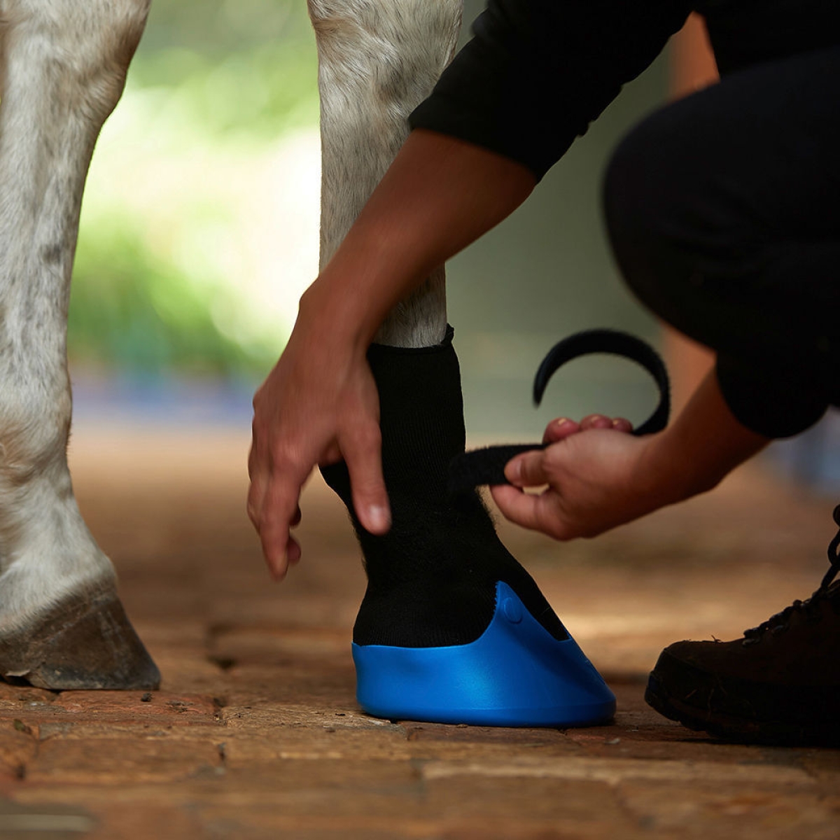 Tubbease 160 mm, bleu Chausson trait. sabots chevaux - l'intérieur de la chaussure n’est ni chaud ni étouffant, car l'air peut s’échapper par le dessus|la partie inférieure couverte d'un revêtement caoutchouté empêche efficacement la pénétration d'humidité et permet en même temps de faire en sorte que le liquide de traitement reste appliqué au sabot|grâce au climat optimal à l'intérieur de la chaussure, le sabot conserve sa solidité|une semelle intérieure en EVA épaisse réduit la douleur à la pression ressentie par le cheval (p. ex. en cas d'ulcère de la sole) et prolonge la durée de vie de Tubbease™|différents remèdes peuvent être utilisés pour traiter les abcès, le pourrissement, les blessures aux sabots, les éclatements de sabot ou autres avec Tubbease™|Le design Tubbease™ est protégé (NZ 417646)|Fond EVA non fourni ! Tubbease™ a été développé en Nouvelle-Zélande dans l’idée de créer pour les chevaux un chausson de traitement respirant pour les sabots à problèmes (p. ex. en cas d'ulcère de la sole ). Grâce aux bandes en scratch livrées avec les chaussures, Tubbease™ peut être fixée de manière idéale à la jambe du cheval.