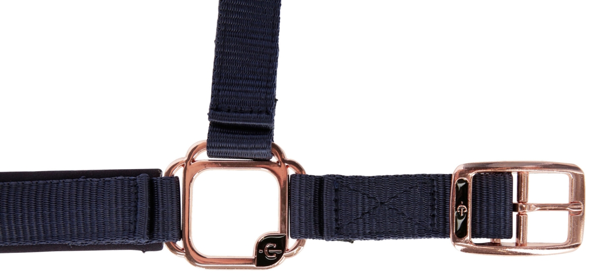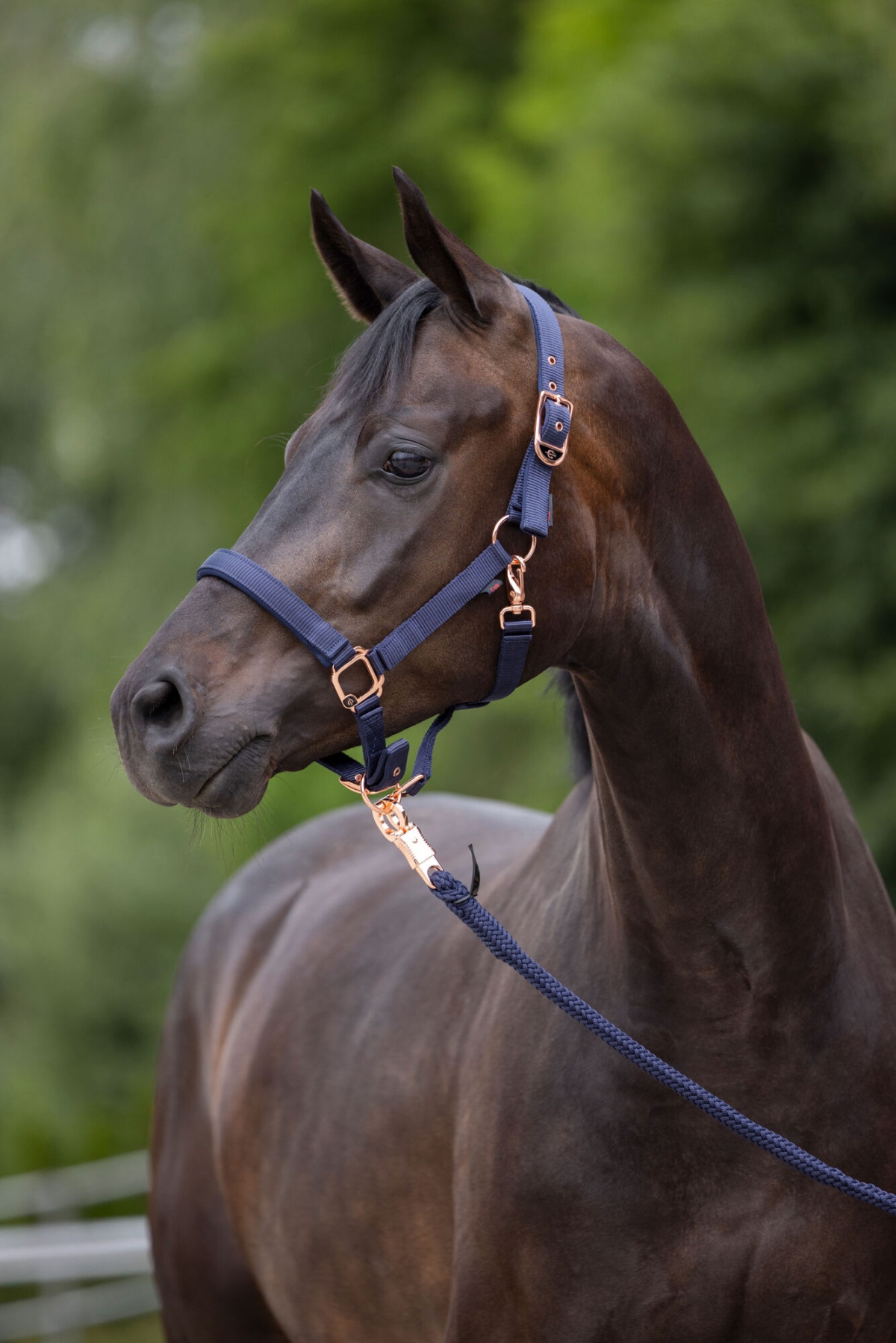 Licol Classy Navy, Pony - licol classique et élégant|muserolle et têtière réglables par bouclage et à doublure douce|en matériau résistant à l'usure, avec coutures solides|ouverture et fermeture pratique du licol par mousqueton|bouclerie esthétique et résistante|œillets en laiton pour éviter que l’ardillon ne glisse de la boucle