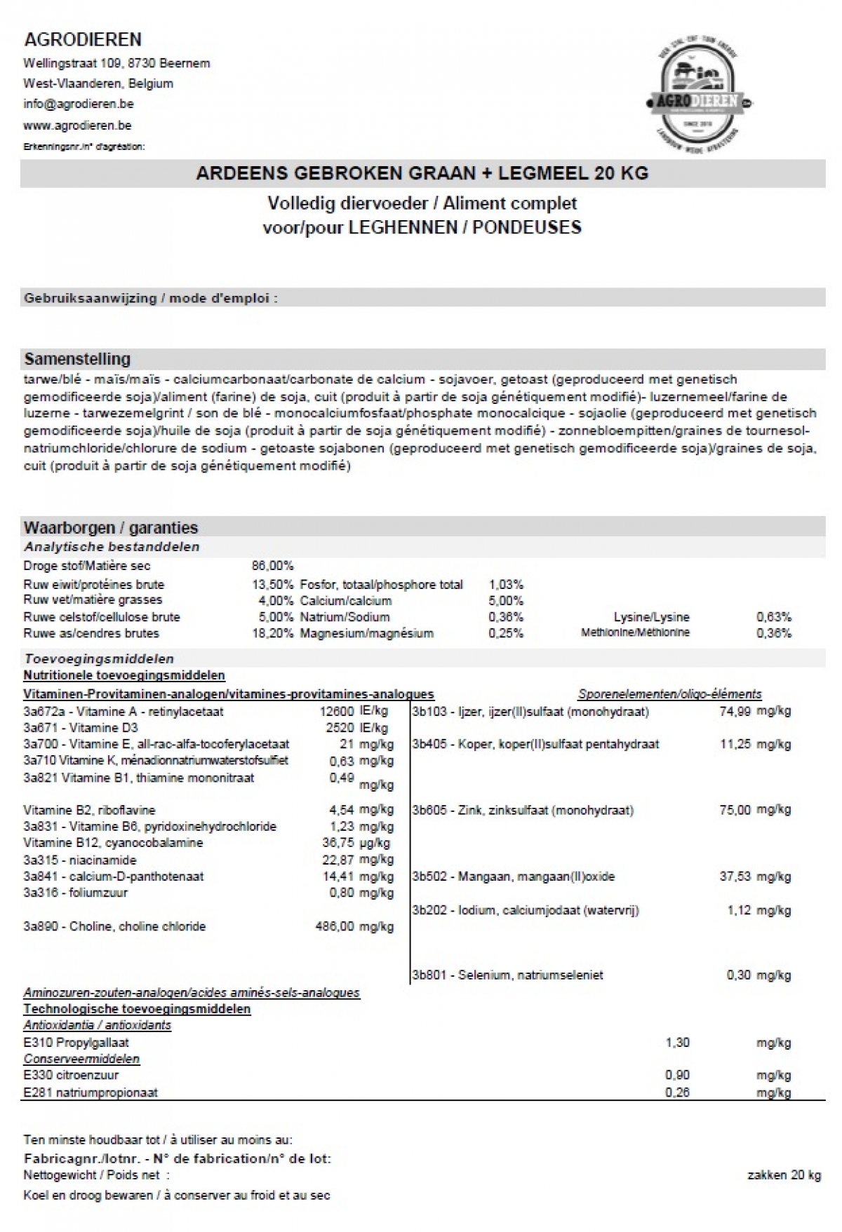 Melange poules d'ardennes casse avec farine poules pondeuses - 20 kg - ( 50 pc/palette ) ARDEENGEBRLEGMEE-20KG-50