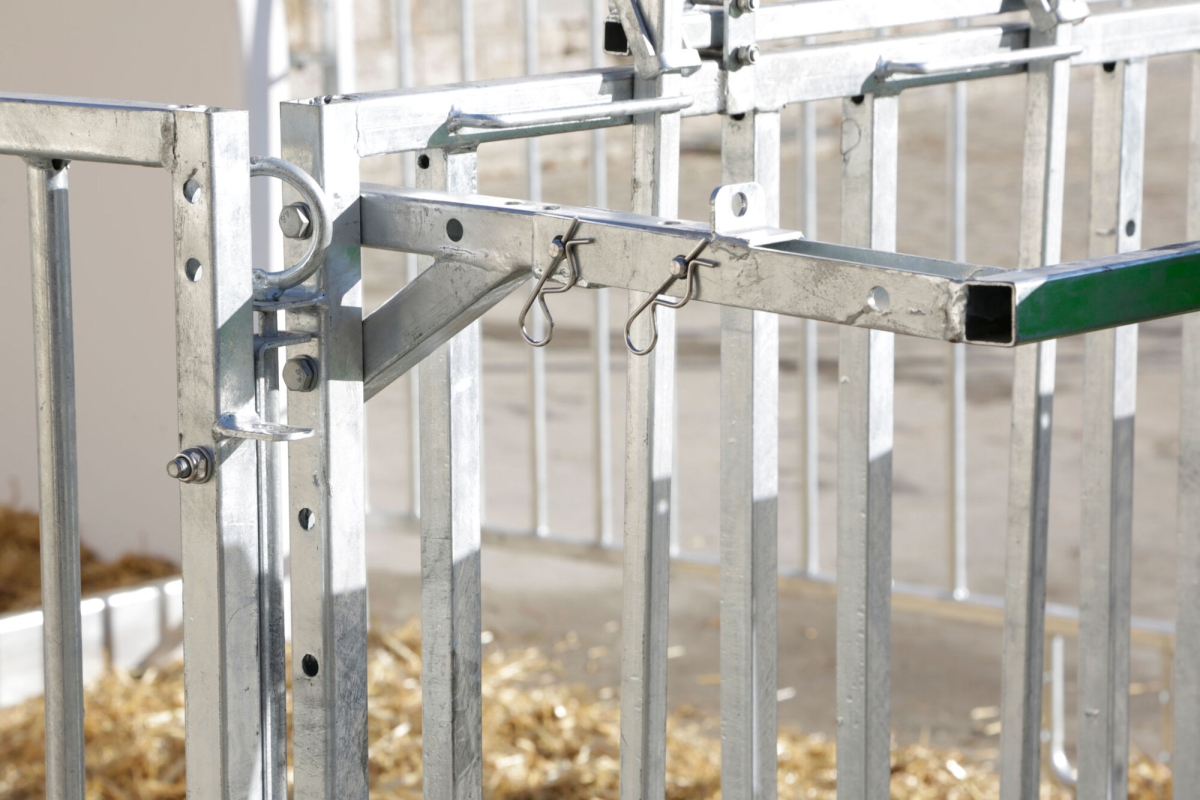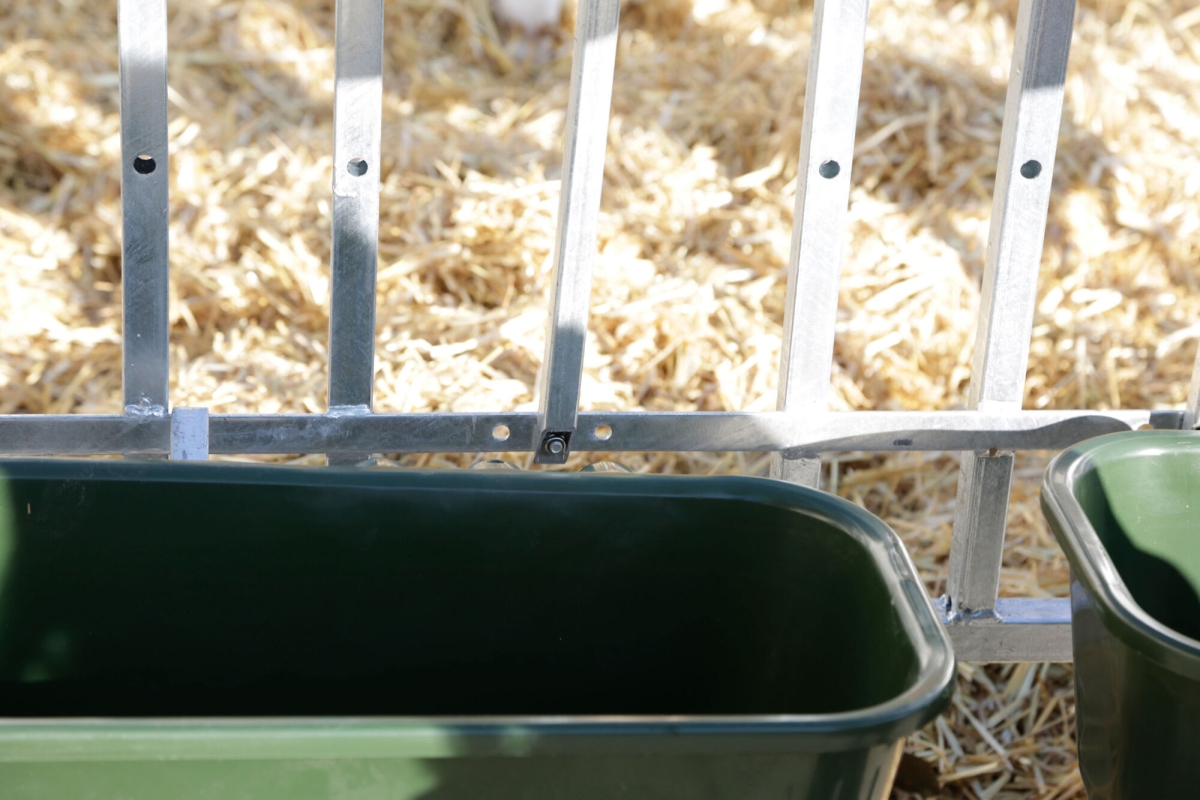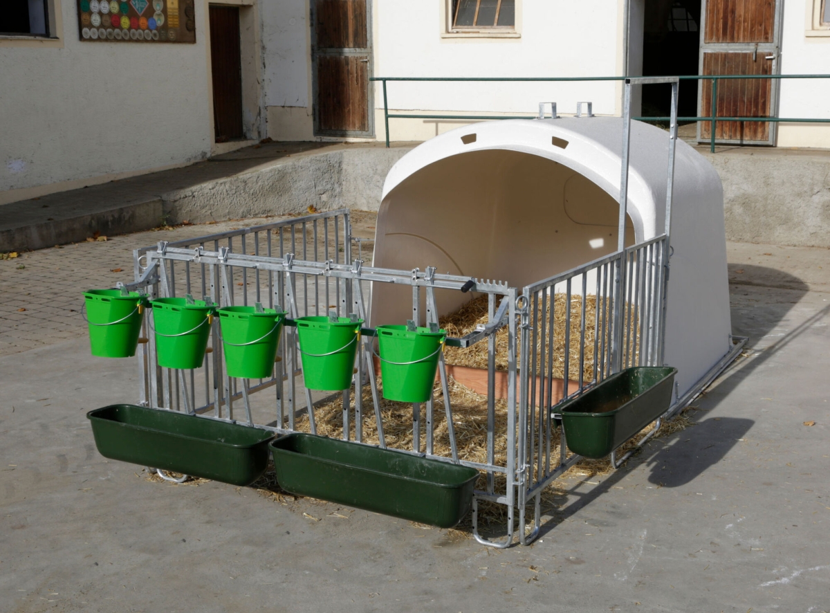 CalfHouse Premium XL porte-seau,supp. mang.+clôture - blocage individuel des mangeoires possible|les barrières latérales peuvent être pivotées vers l’arrière contre les parois de la niche|accès facile via la grande porte d’entrée laissant même suffisamment de place pour le chariot de transport|trous prépercés sur les patins pour l’ancrage au sol|niche et enclos faciles à transporter avec un tracteur|Seaux à veau et mangeoires longues non fournis La grande niche à veaux, fabriquée en plastique renforcé de fibres de verre, peut accueillir jusqu'à 5 veaux (veuillez respecter les directives locales de protection des animaux). La fenêtre coulissante à l’arrière facilite, entre autres, la surveillance des animaux et le remplissage du râtelier à foin (en option).|Le renfort complémentaire est fixé tout autour de la niche pour garantir une stabilité maximale.|La niche à veau avec enclos offre une vue d’ensemble optimale et permet de mieux contrôler les animaux.