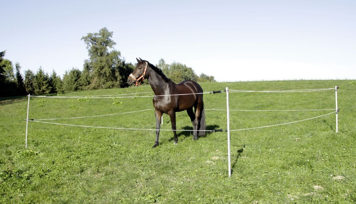 - nouveau kit de compétition / paddock d'env. 7 x 7 m kit composé de 4 piquets métalliques zingués d'une hauteur totale de 165 cm les piquets métalliques sont également parfaitement adaptés en sols secs et pierreux (info complémentaire) équipés de 2 x Flexi-Rope 4 m avec poignée et crochet en inox et 2 x isolateurs de poignée adaptés pas de risque pour les crinières et les queues avec 2 x électrificateurs 1,5 V (batteries fournies) complet dans un sac de transport installation en quelques minutes à peine poids avec appareil : 13,5 kg, sans appareil : 12,5 kg