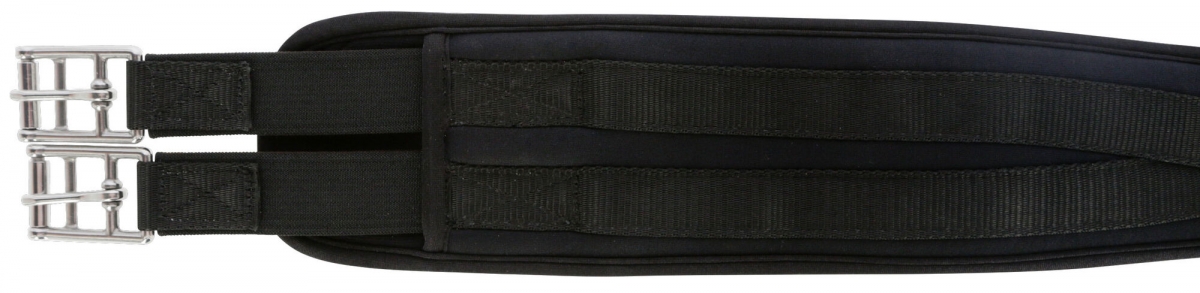 Sangle à mémoire de forme noire, 115 cm - Gaine en caoutchouc de synthèse pour une meilleure résistance et durée de vie prolongée|avec mousse dite à mémoire de forme qui s'adapte très bien aux contours et se pose de manière optimale autour du ventre|liberté de mouvement optimale grâce à la forme arquée|avec maillon D au milieu pour une fixation aisée du collier de chasse ou de l’enrênement|équipée sur un côté de sangles élastiques|avec boucles à rouleau pour un ressanglage facile|Côté de la angle env. 8,5 à 10,5 cm|entretien facile