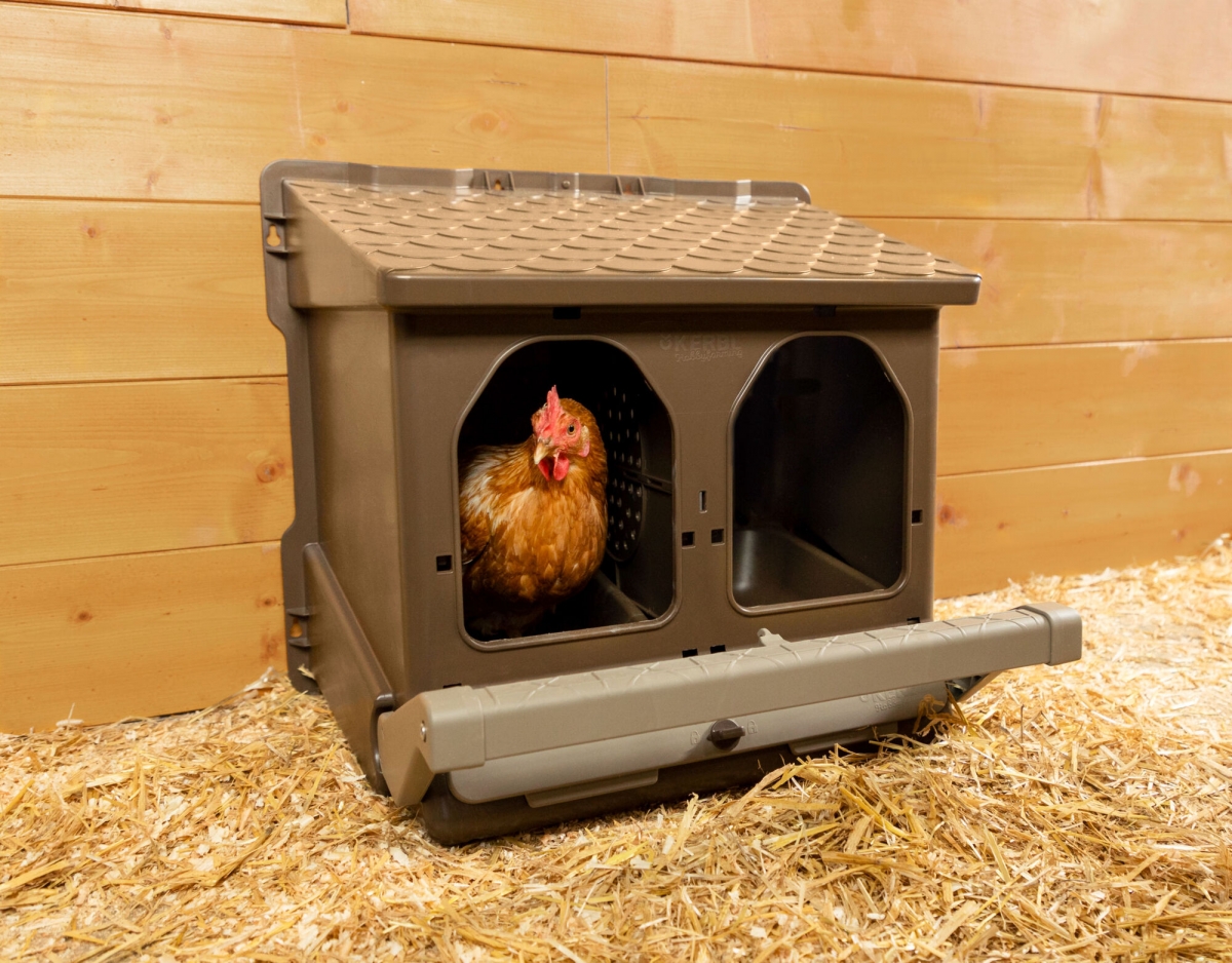 Dubbel legnest van gerecyclede kunststof, apart verpakt - biedt kippen een schone omgeving om eieren te leggen|ideaal voor strooisel|optioneel is een nestschaal voor een gebruik zonder strooisel verkrijgbaar (73147)|interne scheidingswand deel het nest in twee nestafdelingen op|met afsluitbare inspectieklep|hellende grond voor het eenvoudig verwijderen van eieren|eitank met grote capaciteit voor 10 eieren per nestafdeling|zitstok vergemakkelijkt de instap voor de dieren|ingang kan met 's nachts behulp van klapbare zitstok worden afgesloten|dakhelling voorkomt dat kippen op het dak gaan zitten|Binnenmaten nestafdeling (l x b x h): 35 x 25 x 48 cm|ook geschikt voor grote en zware kippenrassen|zonder achterwand|ook geschikt om op te hangen