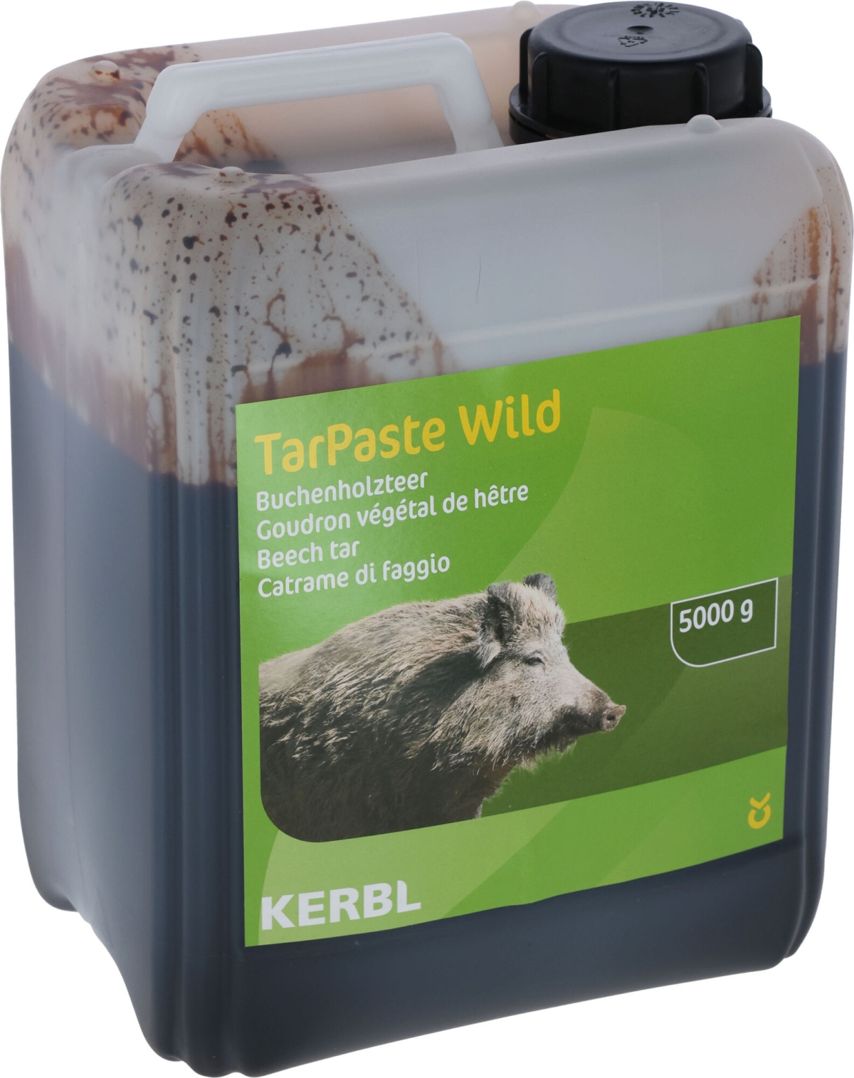 Schwarzwild beukenhoutteer 5 kg - Met deze beukenhoutteer volgens oud beproefd recept bestrijkt u geschikte bomen tot een hoogte van ca. 50 - 100 cm. Wilde zwijnen en herten ruiken de geur van de teer op grote afstand. Wilde zwijnen zullen de behandelde bomen gebruiken om tegenaan te schuren. U moet de bomen om de 2- 3 weken opnieuw behandelen.