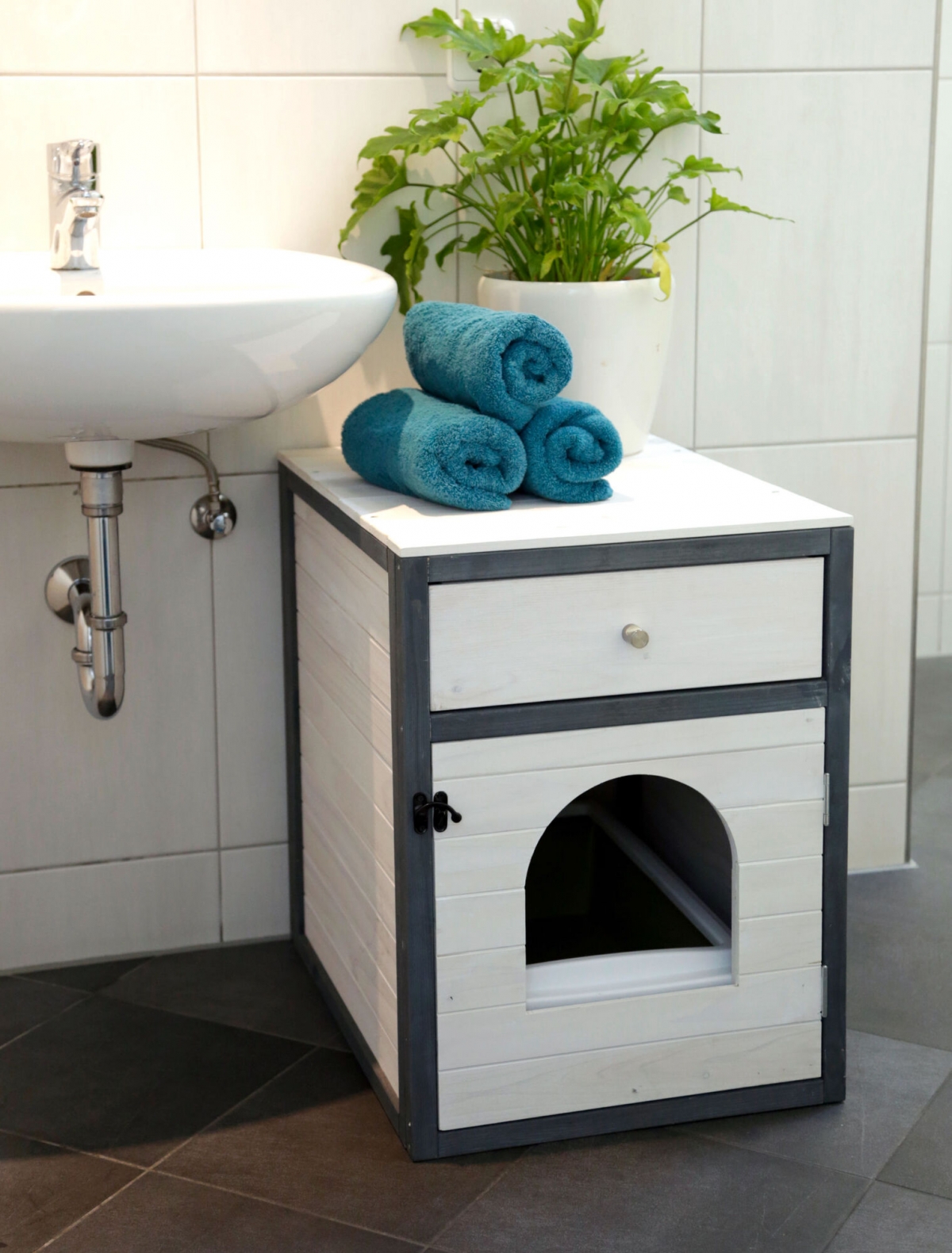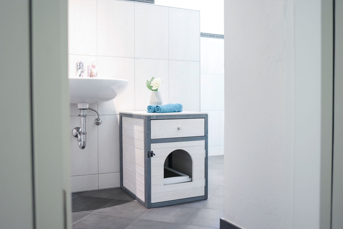 Kattenkast Ida 45 x 58 x 60 cm, wit/grijs - Kattenhuismeubels in een eenvoudig design|met praktische lade voor het opbergen van benodigdheden|geschikt als toevluchtsoord of kattenbak|instaphoogte: 10,5 cm|lade: 40 x 53 x 12 cm|ligkussen of toilet integreerbaar|bijpassende kattenbak 84227 De kast biedt binnenin ruimte voor een kattenbak of een nestkussen. Zo zijn deze noodzakelijke spullen discreet en aantrekkelijk opgeborgen in een mooi meubelstuk en heeft het dier een beschermd toevluchtsoord.