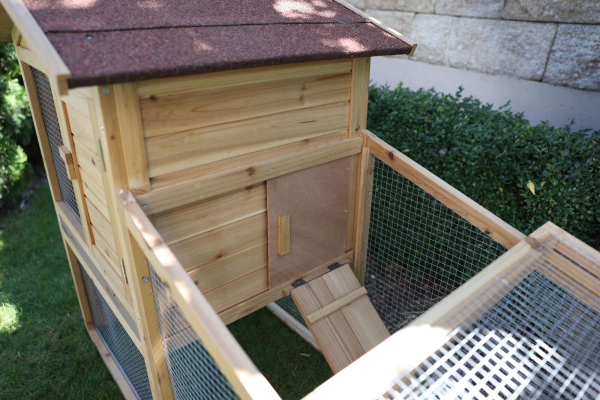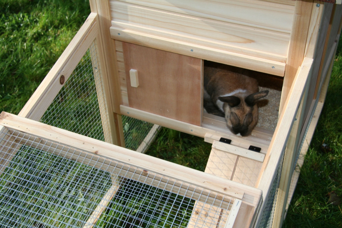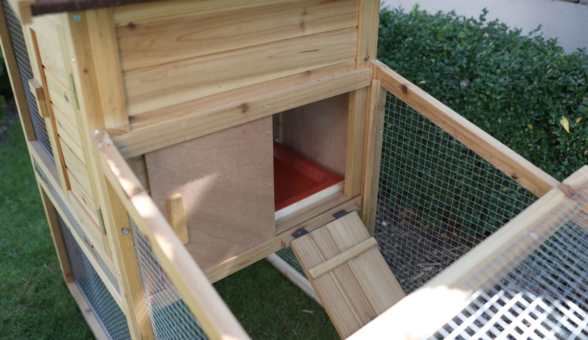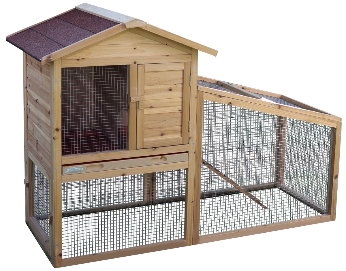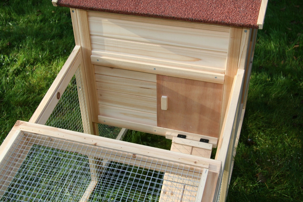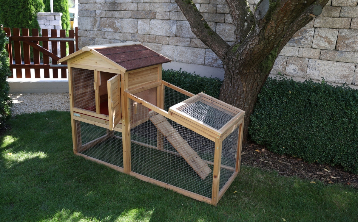 Knaagdierhok FREETIME 140 x 65 x 100 cm - met uitloop|blokkeermogelijkheid tussen de buitenren en het rustgedeelte|weerbestendig bitumendak|roosterranden met houten lijst bedekt|uittrekbare kunststof bak vergemakkelijkt het schoonmaken