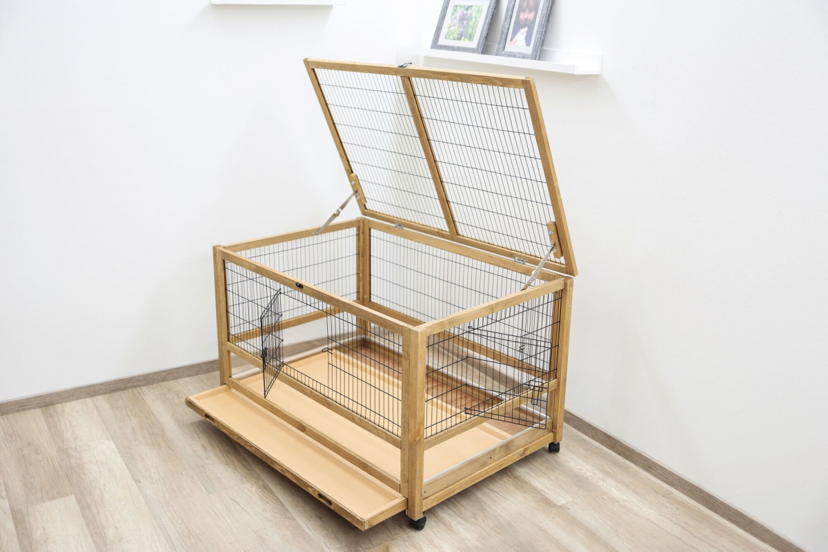 Kooi kl. dieren Indoor Space 116 x 75 x 70 cm - verhoogde randen verminderen uitvallen van strooivoer|plexiglas rondom voor een optimaal zicht op het dier vanuit elke positie|uittrekbare kunststof bak vergemakkelijkt het schoonmaken|rolvoetjes met blokkering voor een makkelijke verplaatsing|dak kan worden open geklapt, met fixatie|twee aanvullende roosterdeuren