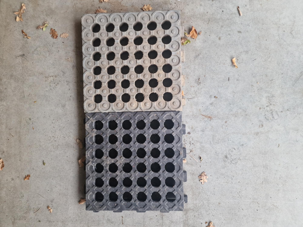 Dubbelzijdig gebruik, dankzij het innovatief ontwerp kan je de platen op 2 legwijzen gebruiken, zodat deze moddervrije tegel veelzijdig inzetbaar is voor dier, erf en bouw: