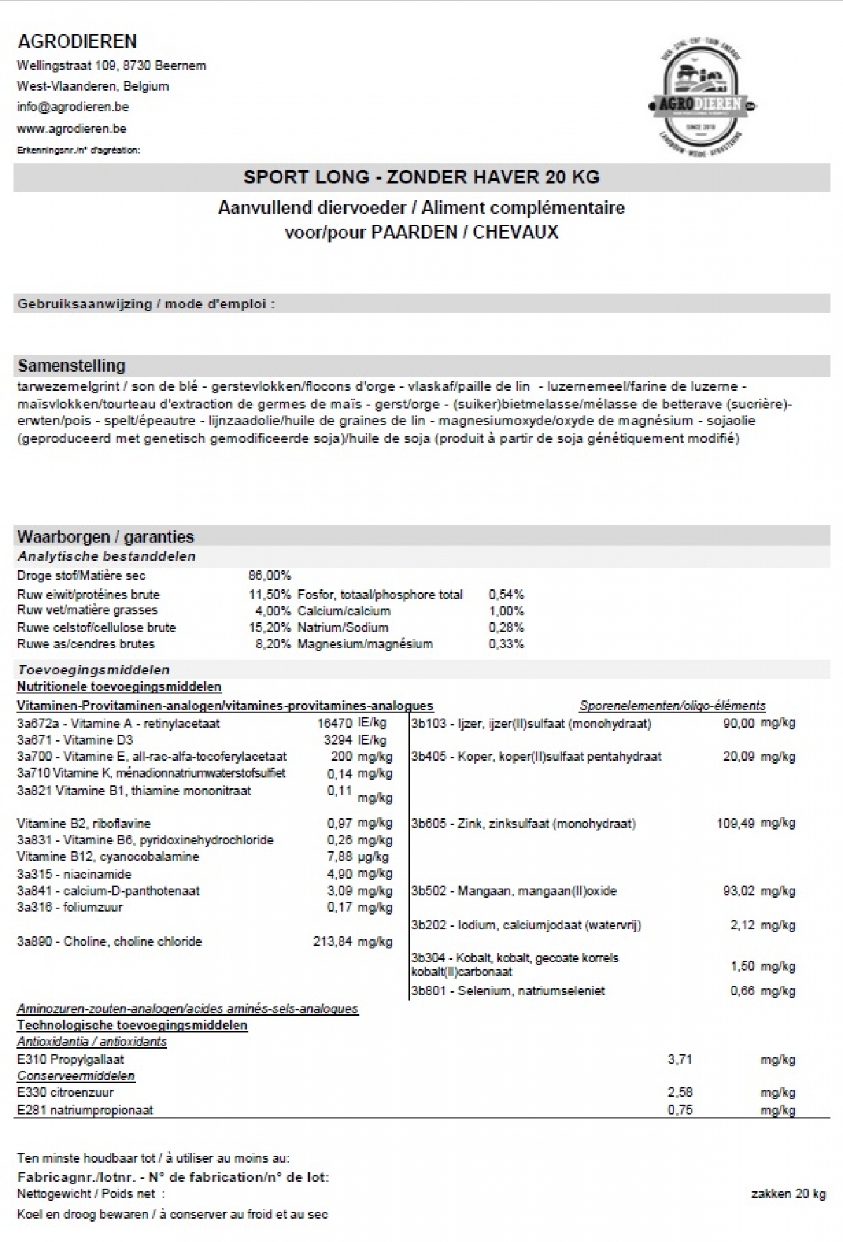 Sport long - zonder haver - 20 kg - super gevitamineerd - losse zak ( label fluo oranje )