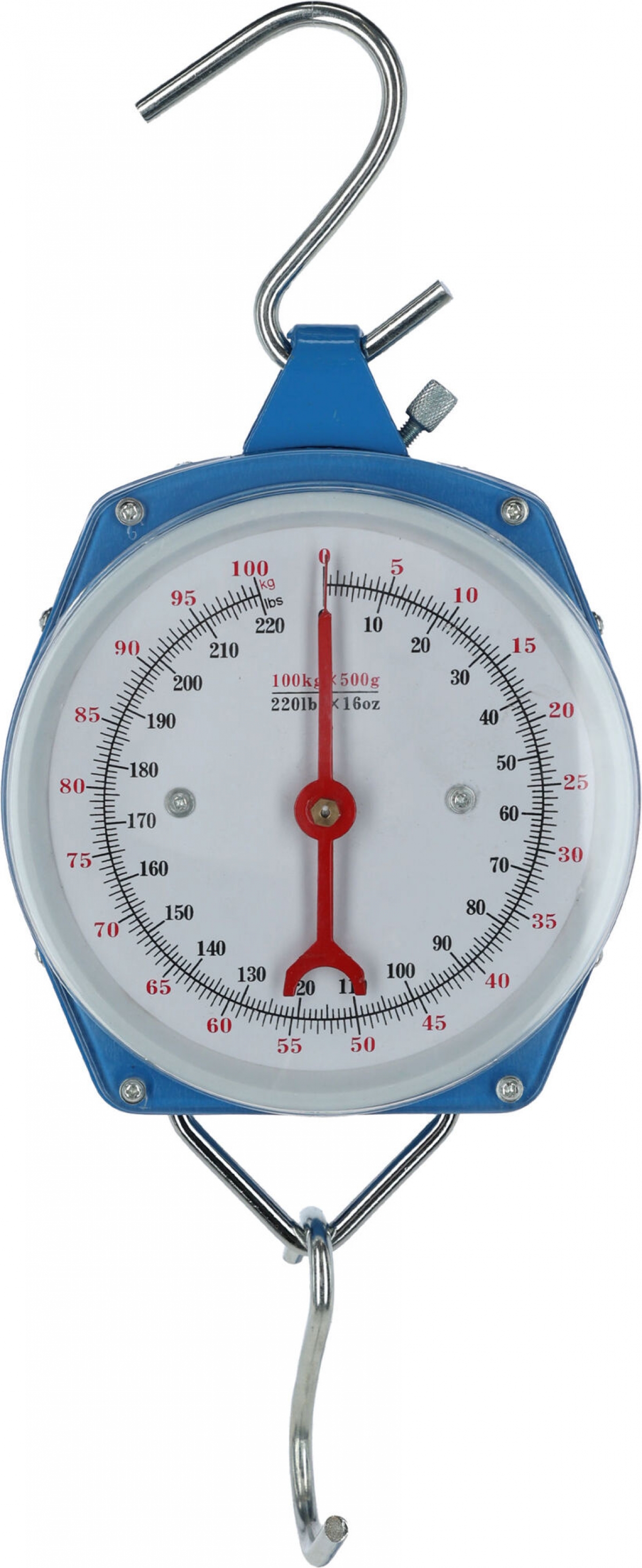 Wijzersnelweegschaal 100 kg kleur blauw - snelle, handmatige gewichtsmeting|veelzijdig te gebruiken, bijv. als voederweegschaal, hooiweegschaal, bagageweegschaal, werkplaatsweegschaal, wildweegschaal|robuust plexiglazen front en stevige behuizing|eenvoudig te gebruiken door twee S-haken|mechanische weegschaal zonder batterijen, altijd klaar voor gebruik